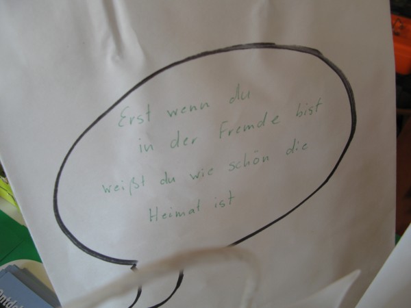 Die "Spruchbeutel" gibt es in den meisten Läden. Wenn man eine möchte, muss man einen Spruch auf eine leere Tasche schreiben. Etliche Sprüche werde über Sprachgrenzen hinweg verloren gehen.