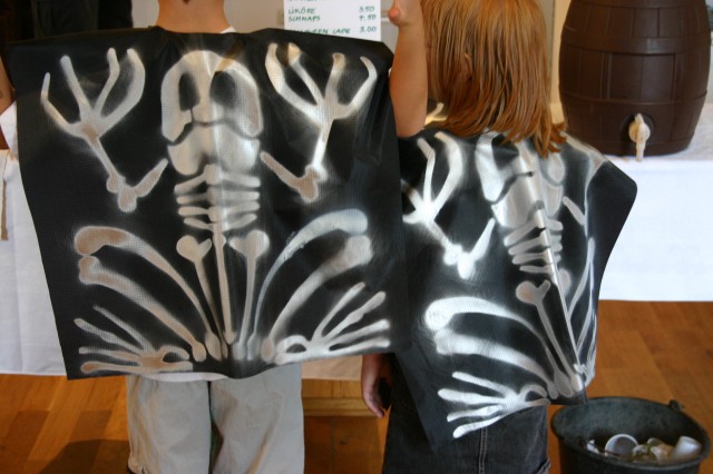 Black nylon, silver spraypaintSchwarzer Nylon, Silberne Sprayfarbe, 2007.Halloween is not a particular Southern German tradition, but has become very popular amongst children in recent years. Here is a cape for Höfener who have the local nickname "frogs".