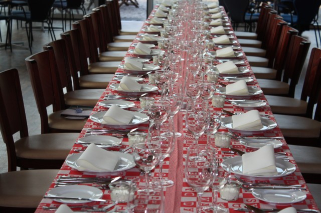 Für das Vorratskammer Projekt von myvillages.org in Berlin wurden Tücher gewebt, rot weiss kariert, und der versetze Schriftzug sagt "Es gibt was da ist".