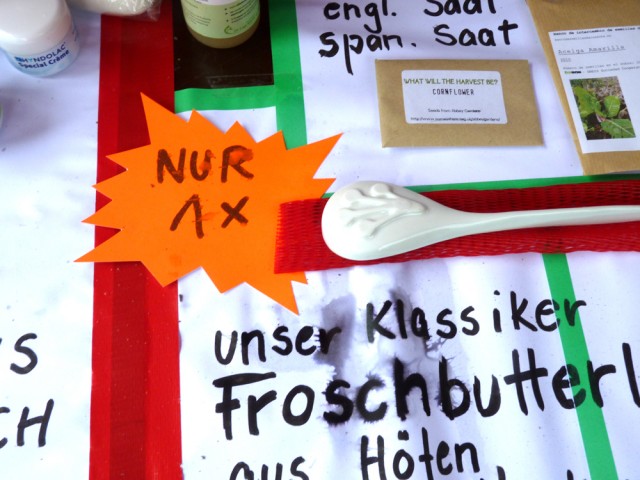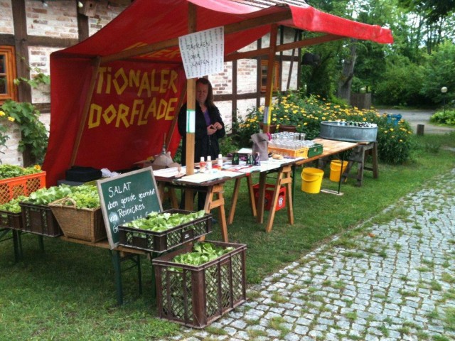 Antje had swapped a good amount of elderberry sparkling wine for an afternoon long shop. The wine should go into the Vorratskammer (larder) project, and the stall to be part of the annual fete by the Friends of historic Gatow. Dozens of freshly cut salads were donated to the shop, and only friendly but firm selling strategies made the shop empty on a rainy but very enjoyable Saturday afternoon.